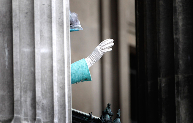 Када она тај покрет начини, „лажна краљичина рука“ почиње да се помера удесно и улево, имитирајући њено „природно махање публици“.