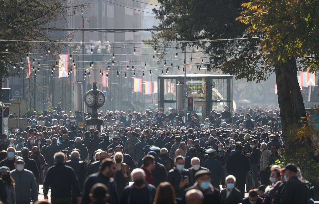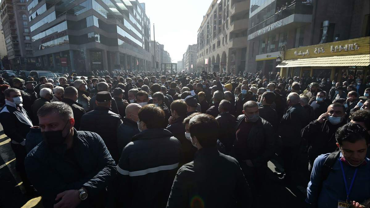 * Окупљени скандирају „Пашињан – издајник!“. Бес доброг дела Јермена није смирило ни то што је председник владе Никол Пашињан у међувремену изјавио да би у руке Азербејџанаца – да није пристао на „болне уступке“ – пали и Степанакерт, и Мартуни, и Аскеран