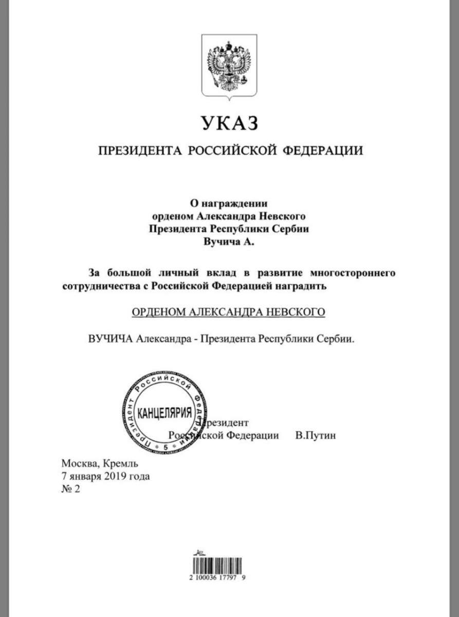 ПРЕДСЕДНИК Русије Владимир Путин потписао је указ о одликовању председника Србије Александра Вучића Орденом Александра Невског.