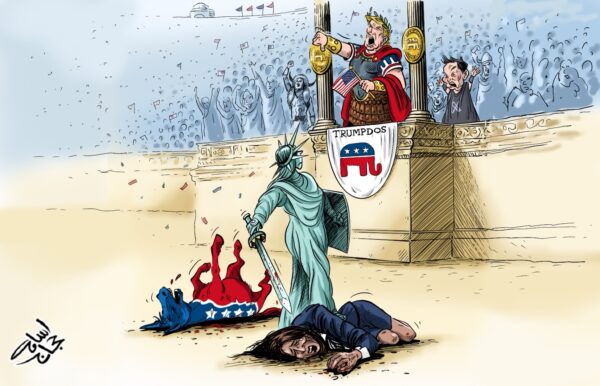 Тренутни „искупљујући наратив“ елита своди се на слоган „мир помоћу силе“, а усмерен је на јачање легитимитета саме америчке моћи, која је кренула путем „присиле и кажњавања“ и унутра и изван САД. Ово, сматра Влахос, представља „међусобно деструктивну динамику“.