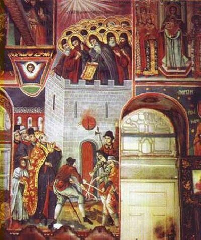 Почетком наредног века Зограф је страдао од каталанских одметника, зграде су спаљене а неки монаси мучени. Позна традиција је ову несрећу приписала присталицама неуспеле уније Православне са Римокатоличком црквом на сабору у Лиону, које су предводили сам цар Михаило и патријарх Јован Век, и папиним најамницима. Историјски извори то не потврђују.