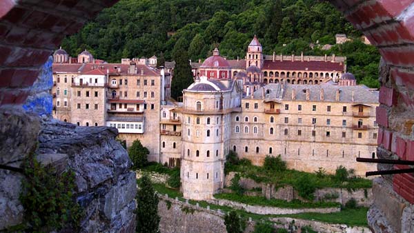 Зограф лежи високо у брдима обраслим шумом, на путу према Хиландару и Ватопеду, удаљен од мора око сат хода, манастирским џипом се то растојање савлађује за четврт сата.