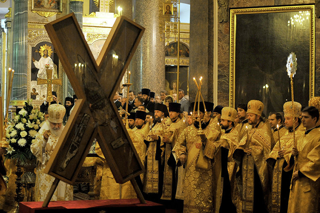 Опроштајна литургија уз певање акатиста крсту предводио је епископ Царскосељски Маркел. Хиљаде људи испратиле су светињу, коју су свечано изнели, уз певање хора саборне цркве, ради слања у Московску област. Крст је послат на путовање у специјалном вагону-храму са Московске железничке станице.