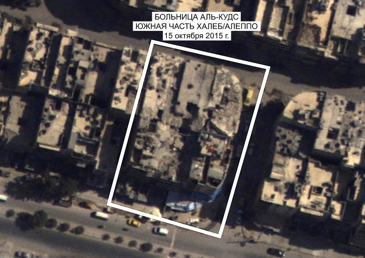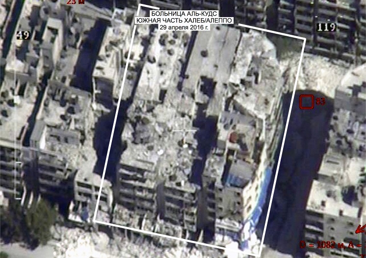 - Портпарол МО Русије, генерал Игор Конашенков, представио две фотографије. Прву је направила руска беспилотна летелица 29. априла и на њој се, како је нагласио, „јасно виде разарања на згради болнице Ал-Кудс. На другој фотографији - која је добијена са шпијунског сателита - види се иста болница, са потпуно истим оштећењима, али је тај снимак направљен још 15. октобра 2015-те године! Конашенков је закључио: „Снимци на несумњив начин показују да су сва тобожња „сведочења очевидаца“ о тобожњем авио-удару по болници 27. априла обична манипулација“