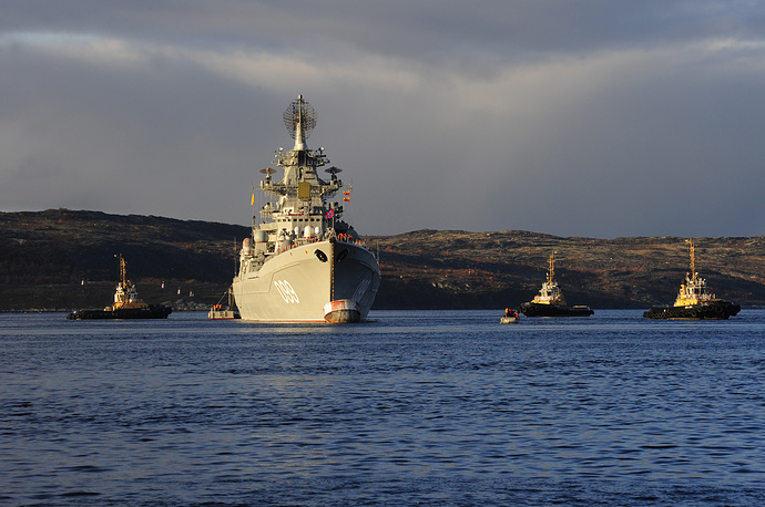У његовој пратњи су тешка атомска крстарица „Петар Велики“, која такође може да носи авионе, и велики противподморнички бродови „Североморск“ и „Вицеадмирал Кулаков“.