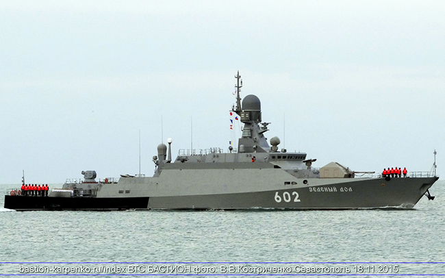 Према Источном Медитерану кренуо је из Севастопоља мали ракетни брод велике ударне моћи „Зелени дол“, наоружан управо тим ракетама чију прецизност и разорну снагу је Исламска држава у Сирији већ осетила. Након што их је из Каспијског мора, са растојања од 1.400 километара, испалила руска Каспијска ратна флотила.