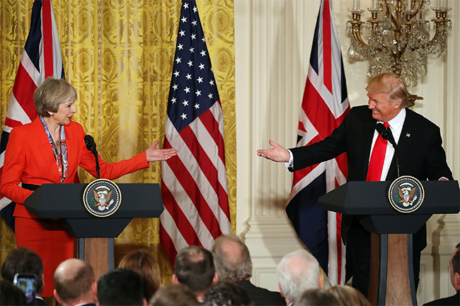 Доналд Трамп је обећао да ће са Великом Британијом закључити нови трговински споразум који ће јој помоћи да изађе на крај са последицама иступања из Европске уније. Трамп је још продемонстрирао наклоност према британској премијерки Терези Меј, нагласивши притом да је његова мајка била Шкотланђана и да се „веома поносила краљицом“.