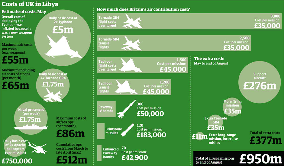- Велику Британију је либијска кампања коштала око 260 милиона фунти стерлинга. Независни посматрачи сматрају да је реална цена те операције за Уједињено Краљевство била од 600 милиона до 1,25 милијарди фунти