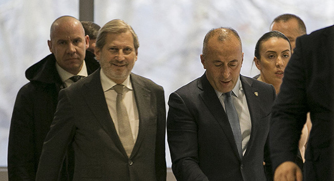 После састанка са комесаром за проширење и добросуседску политику Јоханесом Ханом, Харадинај је на конференцији за медије изјавио да су разговарали о многим темама међу којима су биле и дијалог о нормализацији односа између „Косова“ и Србије као и о увођењу таксе од 100 одсто истичући да ће таксе бити укинуте када Србија призна независност „Косова“.