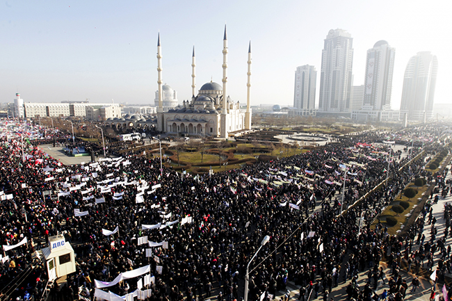 Манифестација „Љубав према пророку Мухамеду“ окупила је у Грозном око милион људи. Њени учесници су држали у рукама транспаренте и плакате с натписима „Њет карикатурама пророка Мухамеда“, „Ми волимо пророка Мухамеда“ и„Ислам је религија добра и изградње“.
