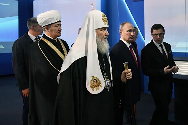 - Руски лидер је у пратњи верских поглавара посетио изложбу „Русија устремљена у будућност“. Том приликом је главним за човека назвао: љубав, доброту и милосрђе. Поред патријарха Кирила, у његовој пратњи су били поглавари муслимана Русије - Равиљ Гајнутдин и Талгат Таџудин и будистички поглавар Пандито Хамбо Лами Ајушев