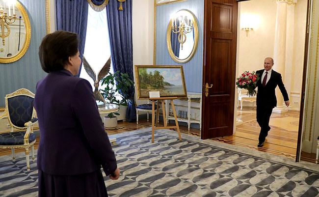 Путин јој је поклонио слику на којој су насликани галебови изнад реке Волге, подсећање на њено позивно име Чајка (галеб) током мисије у јуну 1963. године.