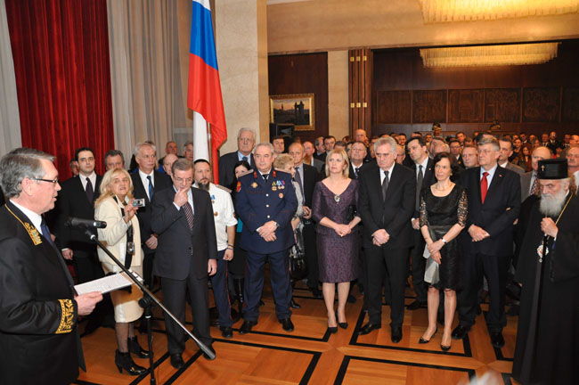 Свечаном пријему присуствовали су Њ.Е. Председник Републике Србије Томислав Николић (са супругом), Њ.С. Патријарх Српски Иринеј, Министар одбране Небојша Родић, Начелник Генералштаба Војске Србије Љубиша Диковић, Министар природних ресурса, рударства и просторног планирања Милан Бачевић, Министар омладине и спорта Вања Удовичић, Министар без портфеља Александар Вулин, као и екс-председник Генералне Скупштине УН-а Вук Јеремић, бројна лица српске јавности и државни званичници.