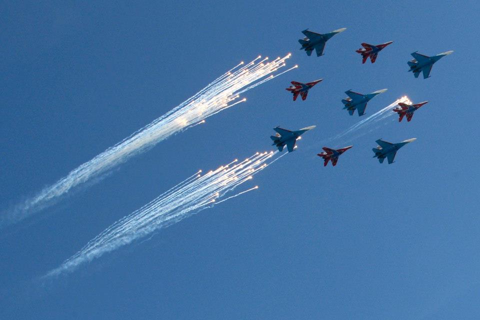 Пилоти акробатских група „Стрижи“ и „Руски витезови“ летели су над главним тргом Русије у саставу од десет авиона Су-27 и МиГ-29.