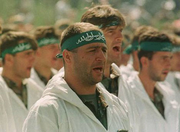 (У тренутку када је снимак заустављен, било је јасно да муслимански војници у цивилу носе сатенске, розе, траке преко чела)