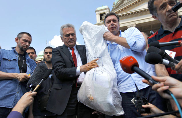 НИКОЛИЋ: Брутално ДС је покрала изборе да би обезбедила себи и врху СПС да формирају нову Владу чиме би зауставили моју борбу против корупције и криминала, мита, моју борбу против сиромаштва, моју борбу за запошљавање, економски програм СНС који би она спроводила као најјача странака и владајућа. Захваљујући храбрости једног човека ми вам сада показујемо шта се десило на хиљаде бирачких места. Ово је материјал, овоје оргинална врећа, погледајте ко је заокружен овде 5, овде 12, ко то има бирачке листиће, ко је заменио, где је штампано ово, зашто нема холограма, што не видимо серијски број бирачког листића?! Знамо шта се десило. Дакле, ово је страшно, ако се десило на једном месту - могло се десити на хиљаду места, замислите да се ово нађе у контејнеру у Србији, гласови грађана Србије. Нема везе што смо ми заокружени, ја чак чак мислим да нису ни гледали ко је заокружен мада су знали да смо у већини ми заокружени. Они су заменили оним што су спремили.