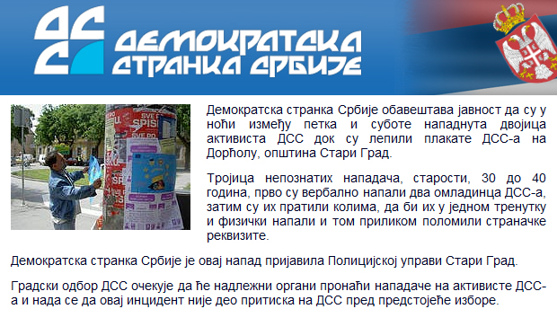 БЕОГРАД, (ФоНет) - Демократска странка Србије (ДСС) саопштила је да су, у ноћи између петка и суботе, нападнута двојица активиста странке док су лепили плакате на Дорћолу, због чега од надлежних органа очекују да пронађу одговорне за напад.