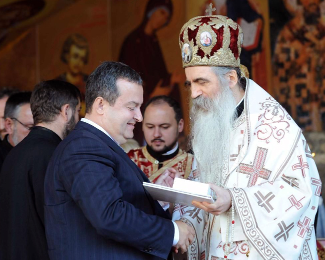Филарет уручио је одликовање епархије милешевске Бели анђео министру полиције Ивици Дачићу, „брату Ивици” зато што је „осветлао образ Србији ових дана”, када су „неке демократе” покушале да је прикују за зид срама