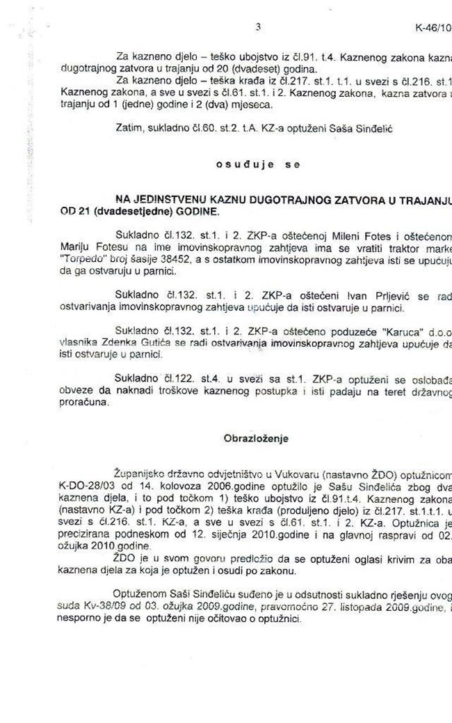 За кривично дјело тешко убиство Синђелић је осуђен на 20 година затвора, а због тешке крађе на годину и два мјесеца. Синђелић се осуђује на јединствену казну у трајању од 21 године затвора, наводи се у правоснажној одлуци суда у Вуковару.