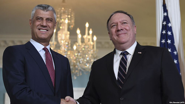 * Тачи је током боравка у Вашингтону разговарао са Мајком Помпеом и Џоном Болтоном. Признаје да је импресиониран тим састанцима и открива: „Обојица су врло јасно указали да је сада тренутак да се постигне свеобухватни споразум између Косова и Србије и да овај тренутак треба максимално да искористе сви актери на Косову и у Србији - под окриљем ЕУ и уз снажну подршку САД. Ова прилика је реална