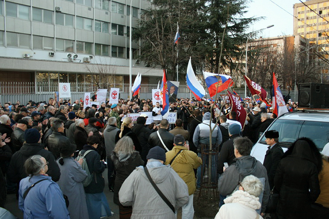 На скупу у Београду су говорили чланови Старешинства Покрета Двери Владан Глишић, Зоран Радојичић и Срђан Ного, затим проф. др Мила Алечковић и др Миша Ђурковић (Српски код), а скуп је завршен тако што је делегација Покрета Двери предала писмо за Амбасадора Руске Федерације Александра Васиљевича Чепурина.
