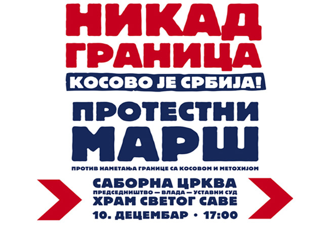Иницијатива Никад граница заказала је за понедељак, 10. децембра у 17 часова протестну шетњу од Саборне цркве до Храма Светог Саве, усмерену против успостављања границе између Космета и остатка Србије.