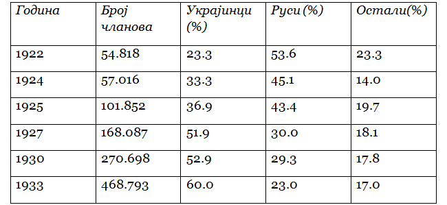 - Комунистичко „укорењивање украјинства“ је дало одређене резултате, што се може видети на примеру броја чланова и кандидата за чланство у Комунистичкој партији у периоду 1922-1933. године. У току само једне деценије број Украјинаца се повећао за скоро три пута, док је број Руса опао за два и по пута