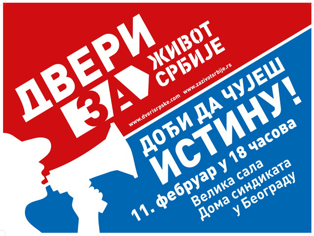 Насупрот апатији која је обузела цело српско друштво, Покрет Двери - За живот Србије креће у контранапад и позива све који се нису предали да 11. фебруара 2012. године, у 18 часова, дођу у Дом синдиката у Београду, да чују истину о нама и нашу поруку: