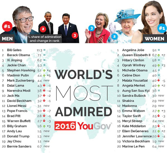 Трећи пут узастопно, прво место је доделио оснивачу Microsoft Билу Гејтсу. Одмах иза њега су: Барак Обама, па двојица Кинеза – председник НРК Си Ђинпинг и глумац Џеки Чен.